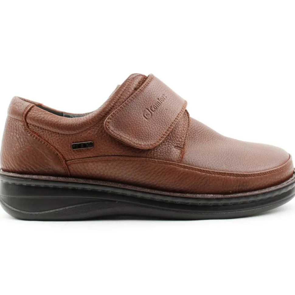 Mens casual shoes from G Comfort. These wide fitting mens shoes have soft leather uppers with Tex lining to keep feet dry and warm during wet weather. A single velcro strap & fold down tongue allows for easy on & off. Removable leather insoles for those who need orthotics. Rounded Toes & Wide Fitting.