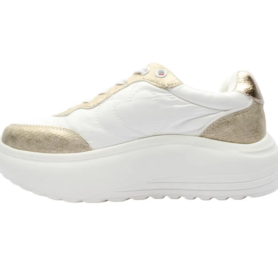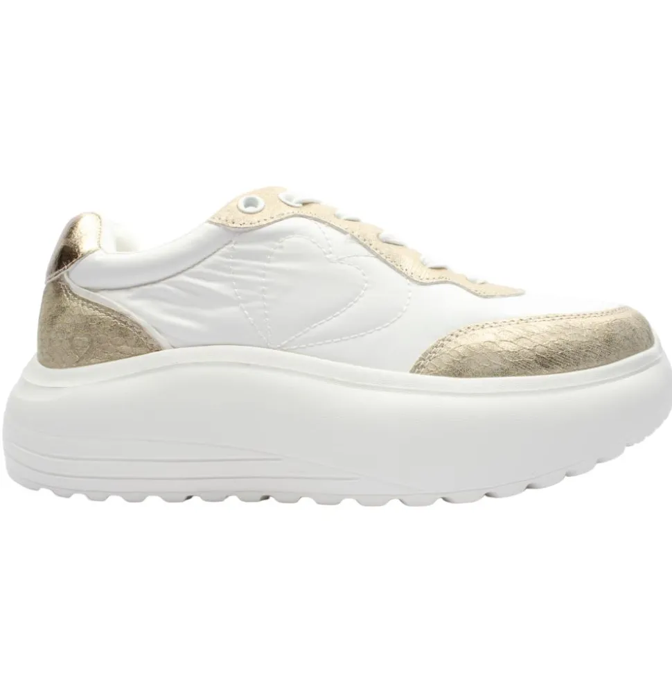 Step into style and comfort with the Heavenly Feet Ladies Platform Runner, crafted in a fresh white material and elevated with elegant gold detailing for a touch of luxe. Designed with a contemporary platform sole, these runners offer a flattering lift while ensuring all-day wearability. Adding a hint of charm, subtle heart-shaped stitching decorates the side panels, bringing a playful yet refined twist to this modern classic. Whether you’re dressing up casual denim or adding polish to a sporty look, these sneakers are the perfect finishing touch.