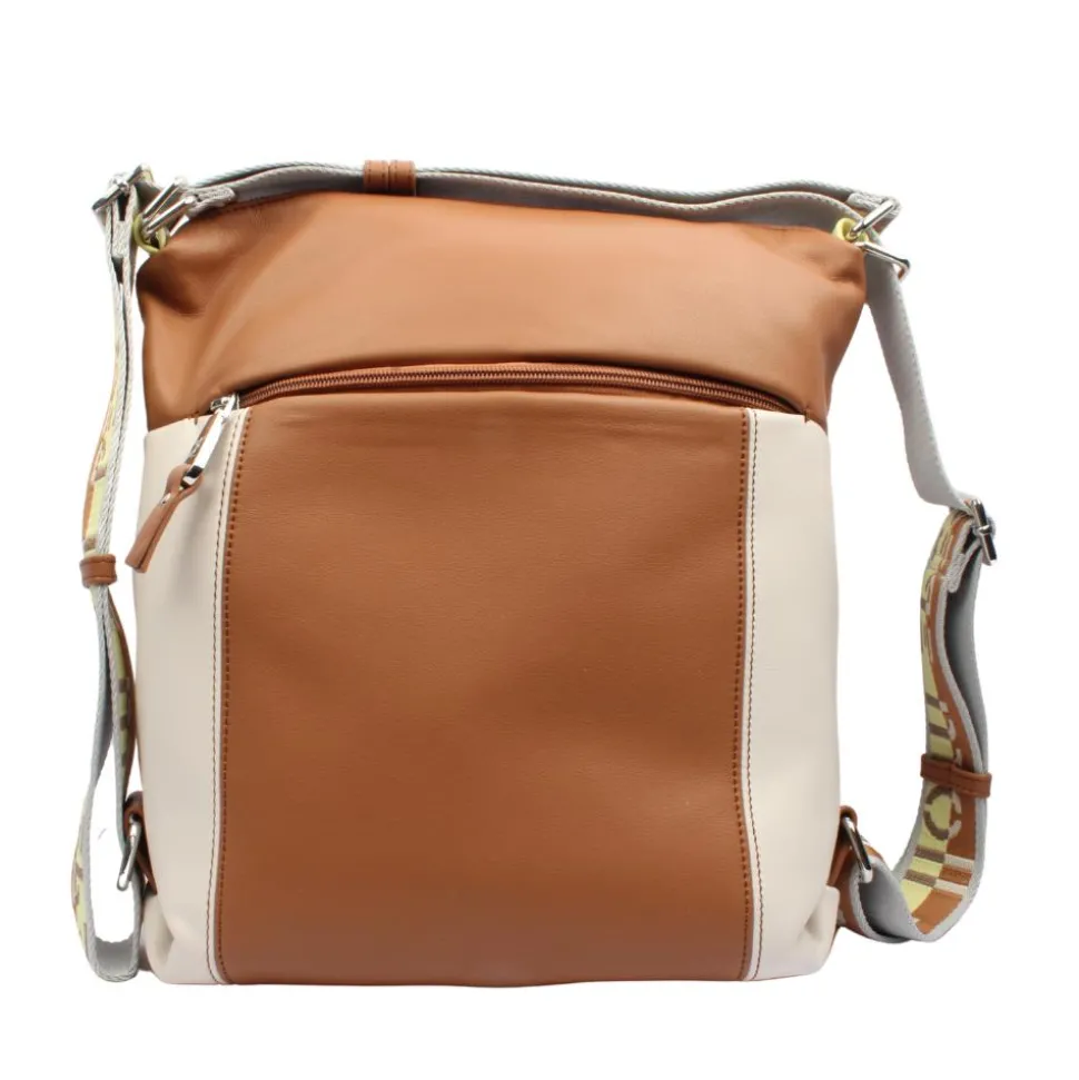 Function meets fashion with the Pepe Moll 251235 Multi-Way Handbag, a modern, versatile design made to keep up with your lifestyle. In a timeless Tan and off white colourway, this bag effortlessly blends practicality with everyday style. Crafted with a secure top zip closure, plus both front and back zipped pockets, and an inner secure zipped compartment, your essentials stay organised and safe wherever you go. Wear it on the shoulder for a classic look or adjust the side straps to convert it into a comfortable backpack – perfect for busy days and hands-free moments.