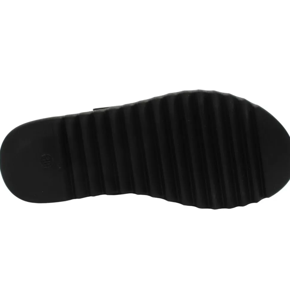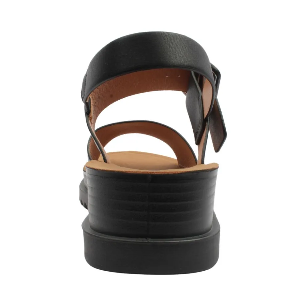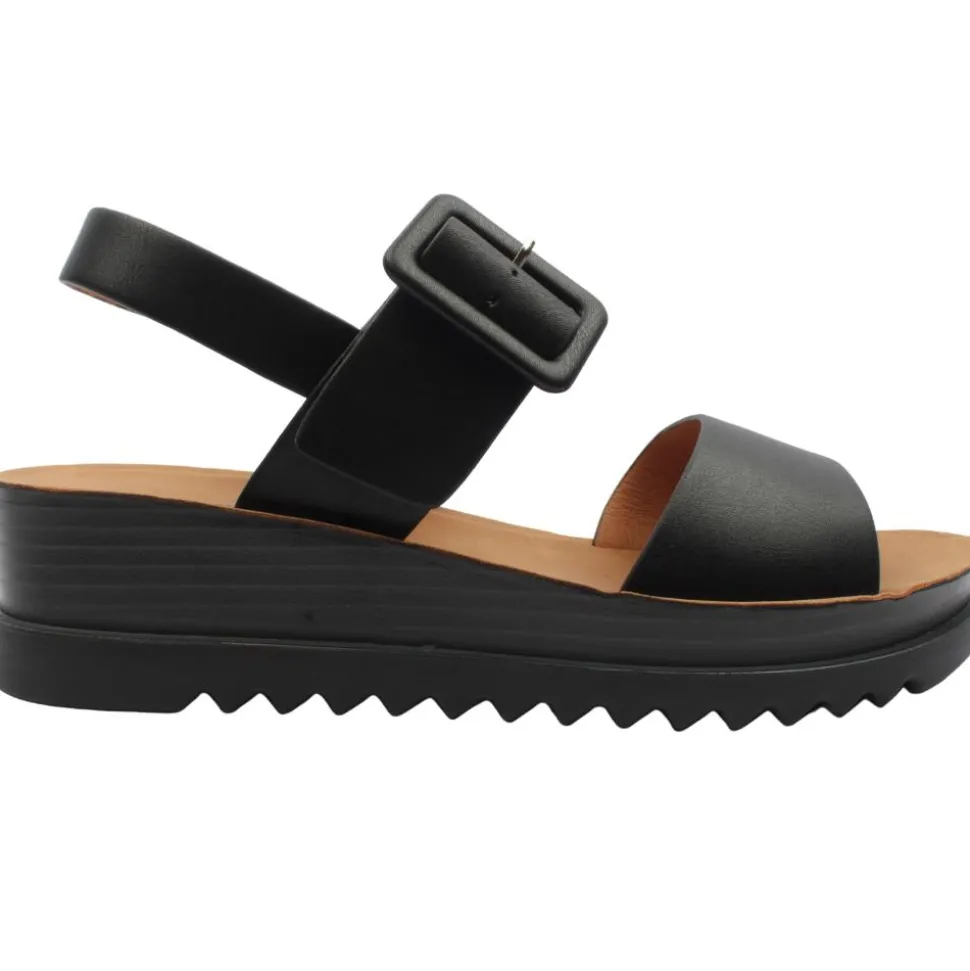 Ladies sandals from Heavenly Feet shoes. Designed with an all black upper with chunky strap details.The wedge sole unit provides a comfortable lift, making them perfect for all-day wear.