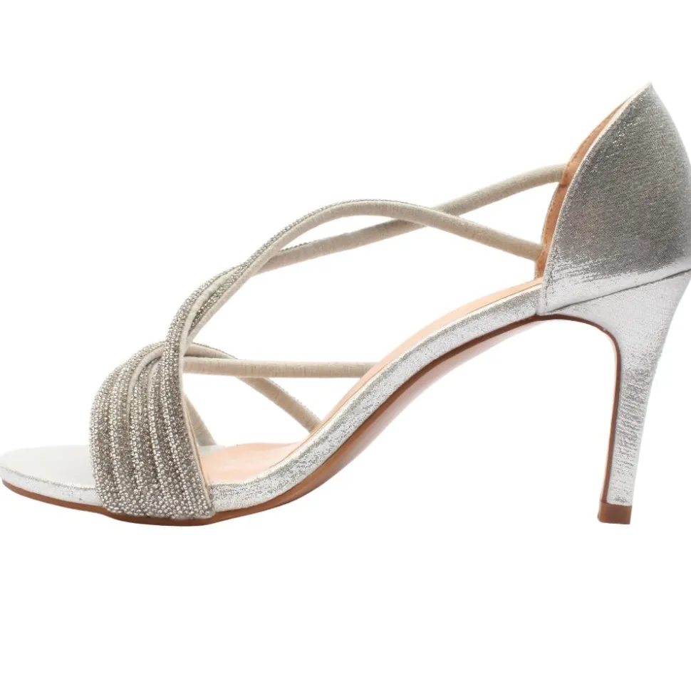 Step into the spotlight with these stunning silver high heel sandals, designed to exude glamour and sophistication. Featuring a chic crossover diamante strap deisgn, these heels add a touch of sparkle to every outift. The elegant open-side design along the inside of the foot creates a sleek and modern silhouette, perfect for showcasing your unique style.