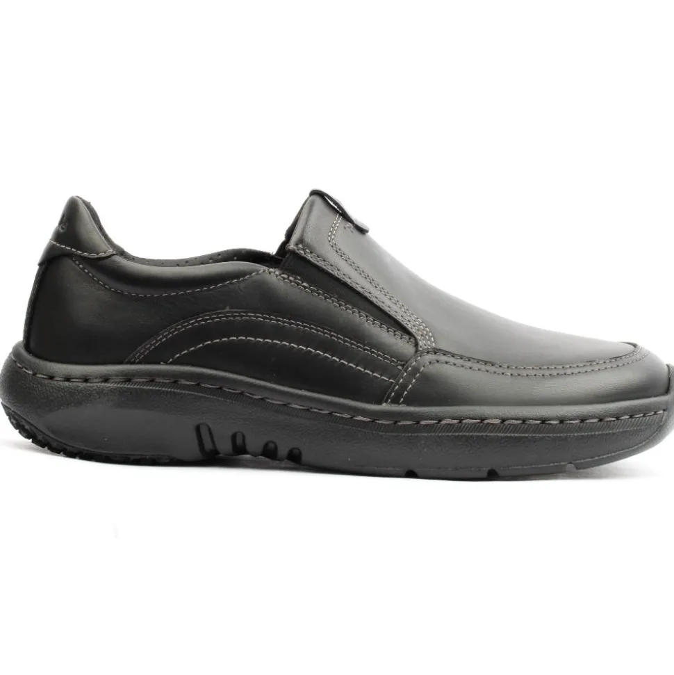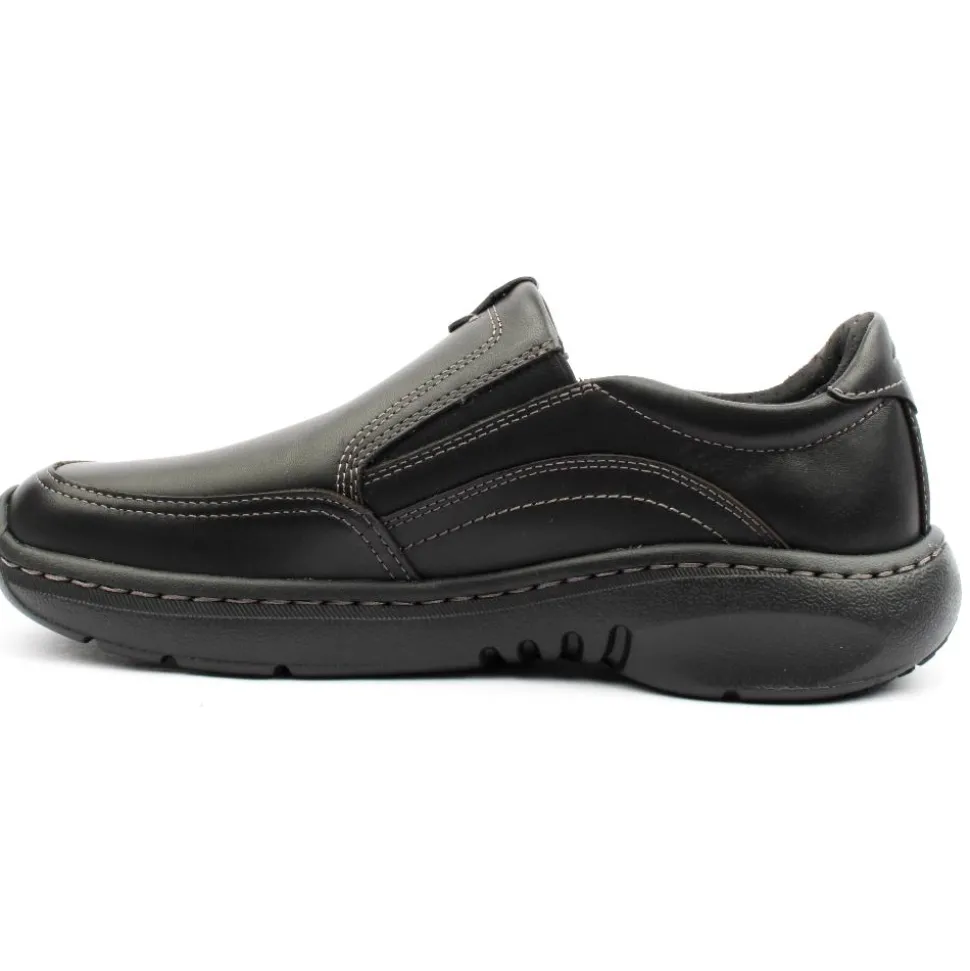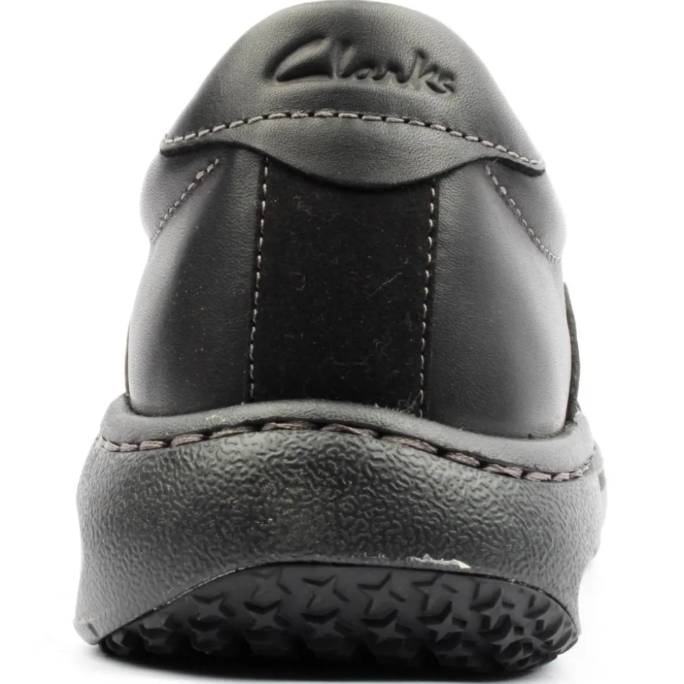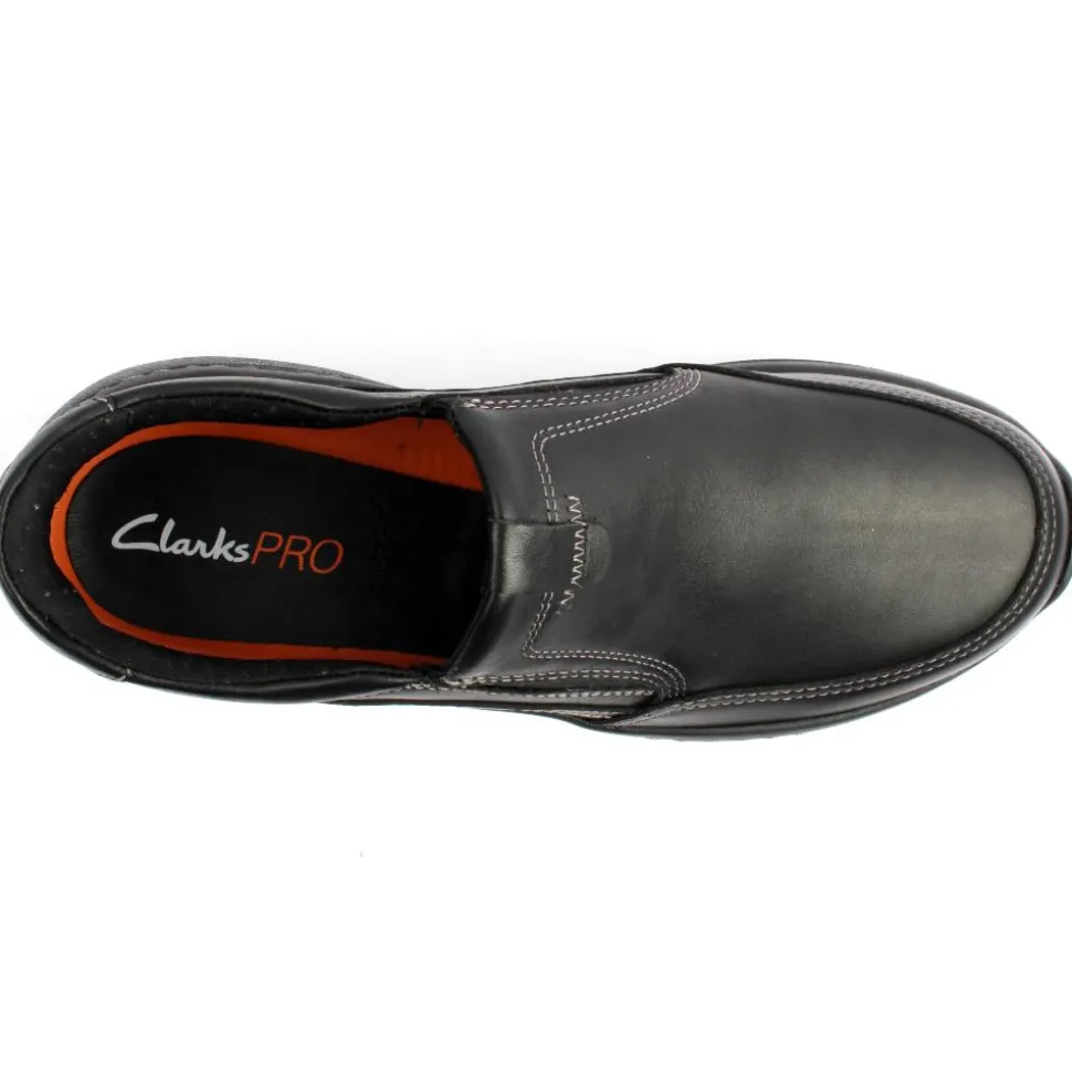 Mens slip on shoes from Clarks Shoes. These mens shoes have a black leather leather upper. Double elastic guessets make them an easy style to slip on/off.They have a Clarks Pro removable insole. An EVA moulded footbed and midsole takes they impact out of each step.
