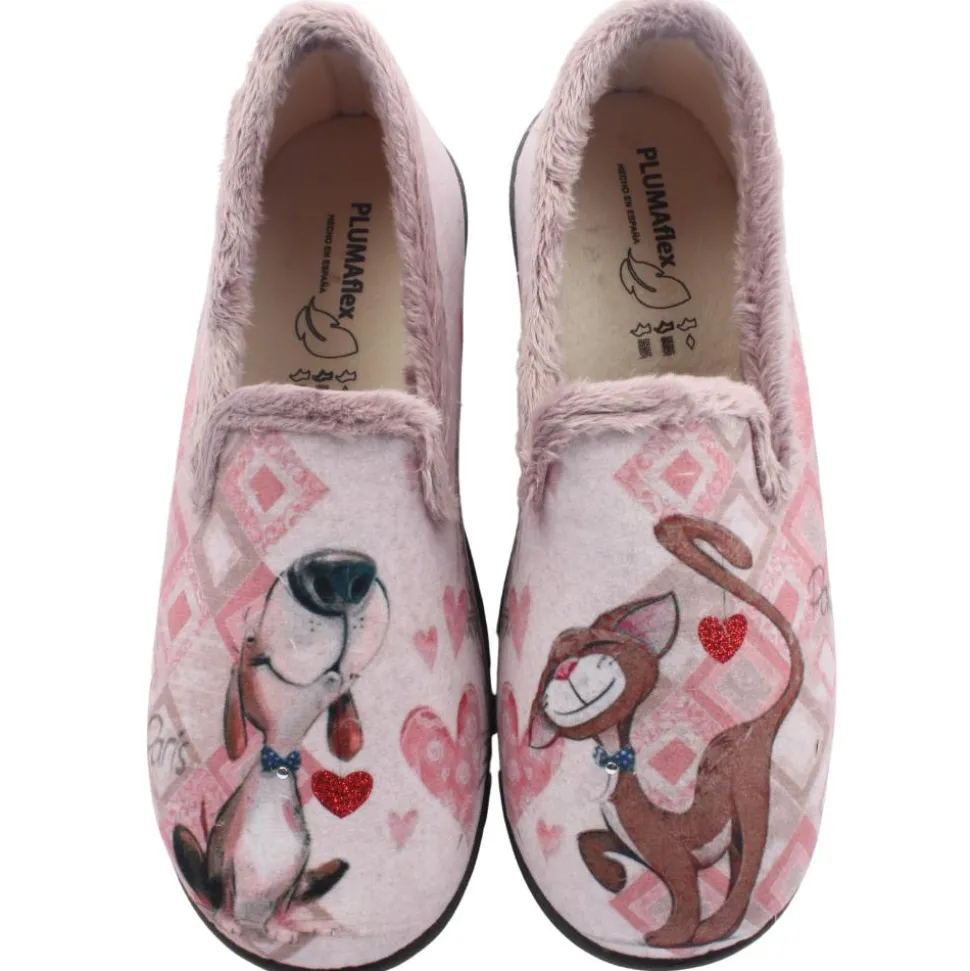 Ladies Slippers from Plumaflex Slippers range.These ladies slippers have a cute cat & dog design.A fresh e ucalyptus s cented smell, cushioned memory foam insoles, fleece uppers & durable outsoles. Ideal Christmas Gift.