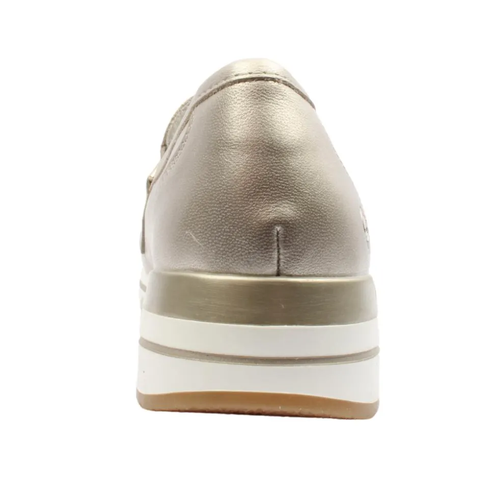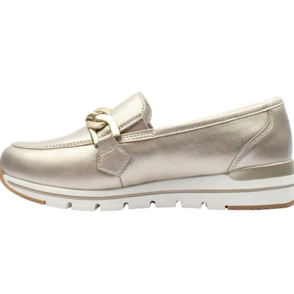 Stylish womens loafers from Remonte shoes in a metallic gold leather upper. These shoes are designed with elastic gussets and a Remonte soft sole for optimal comfort. A simple shoe for every outfit