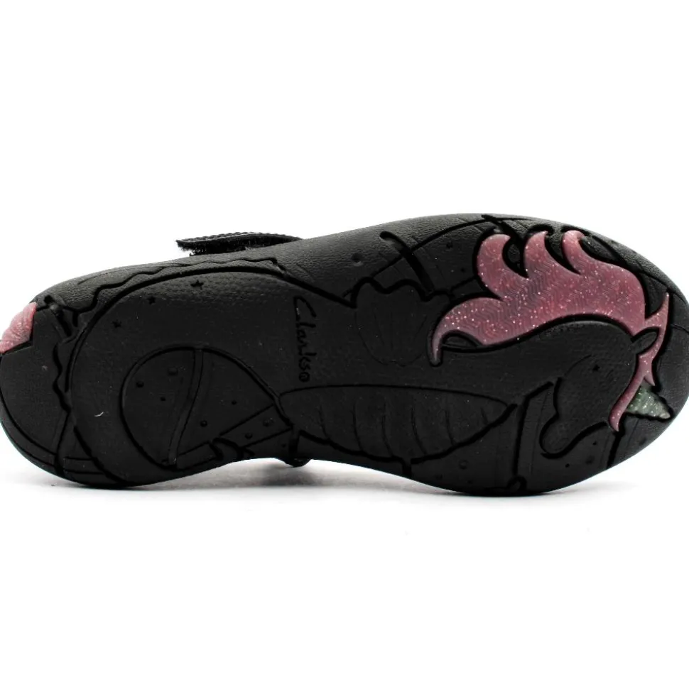 Girls School Shoes from Clarks. This Girls Mary Jane style Shoe offers a touch of magic with I ts playful Esmerelda the Sea Unicorn motif and fun seashell decorations. It secures with an adjustable riptape strap and keeps little feet comfy with extra padding around the ankle. Glittery ombre details and a golden mermaid tail charm seal the deal.