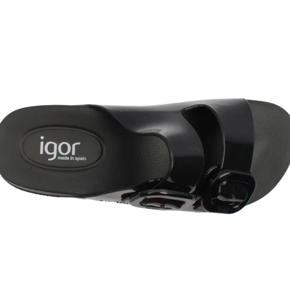 Women’s sandals from Igor shoes. Step into comfort with lightweight and flexible sandals. Designed with a sleek black patent upper and double buckle closure allowing an adjustable fit.