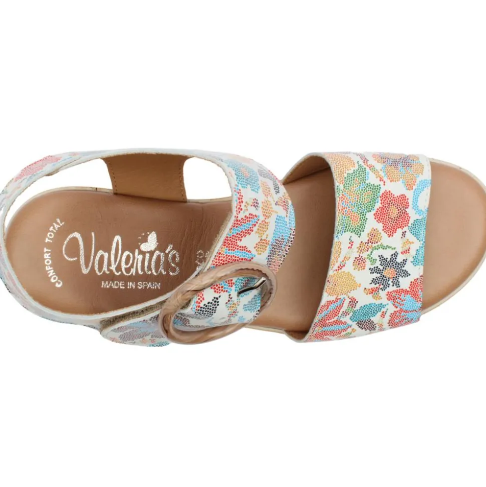 Women’s sandals from Valeria’s shoes. This gorgeous sandal is designed with a colourful flower design upper. Featuring a Velcro strap closure allowing an adjustable fit. This sandal has Valeria’s comfort total insole offering optimal comfort. The perfect addition to your summer wardrobe.