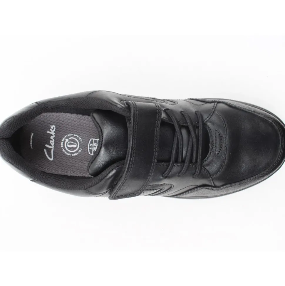 Boys Black Shoes from Clarks. These Boys Back to School Shoes are designed using a soft leather upper with elastic laces & single velcro straps for easy on & offf. Insoles made from 50% recycled content.