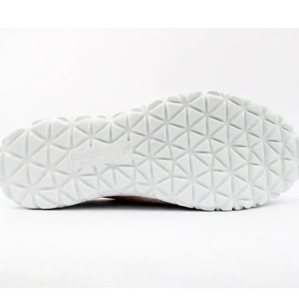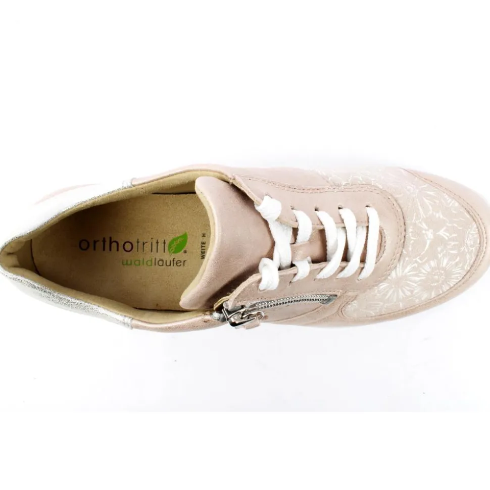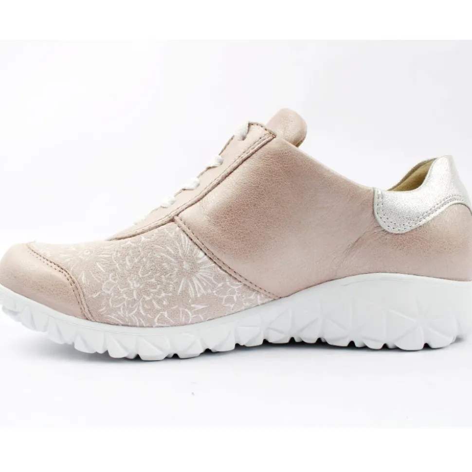 Ladies Casual Shoe from Waldlaufer. These Ladies Wide Fitting Shoes have a Blush Pink upper with floral detailing in a material that will stretch with your feet. Removable cushioned leather insoles. This style is “H” Extra Wide Fitting,zip and lace for easy on & off