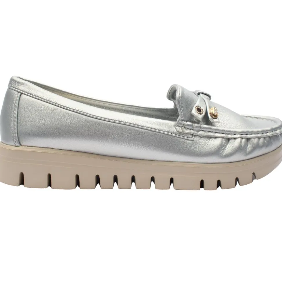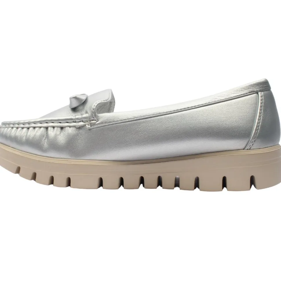 These l adies loafers in a silver upper are a stylish and versatile choice.Featuring a bow detail on the front. They ahve a cushioned insole for all day comfort.