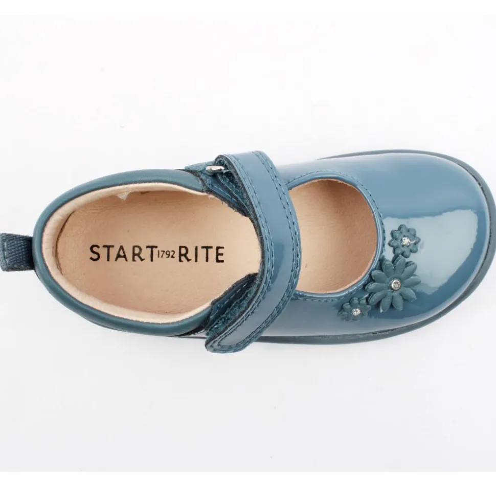 Cute girls first shoes from the Startrite collection. These girls shoes have a soft blue patent leather upper with a floral detail on the side. A velcro strap closure allows for easy on/off while keeping the foot secure. The leather lining & padded collar add to the comfort of the shoe.