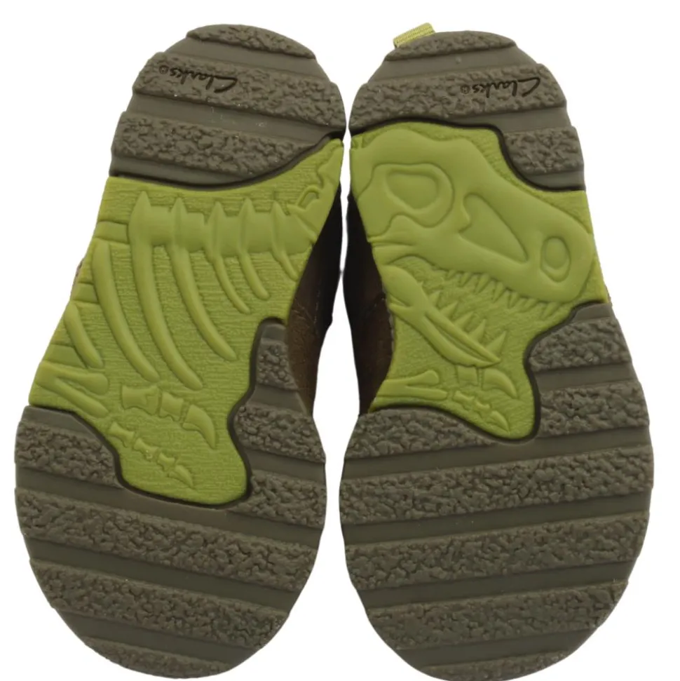 Boys shoe from Clarks . This sneaker style shoe has 3d spine-details to the heel and dinosaur motifs decorating the flexible rubber outsole. Keep feet comfy all day with padding to its tongue and collar while an odour control – technology brings a super fresh feel.
