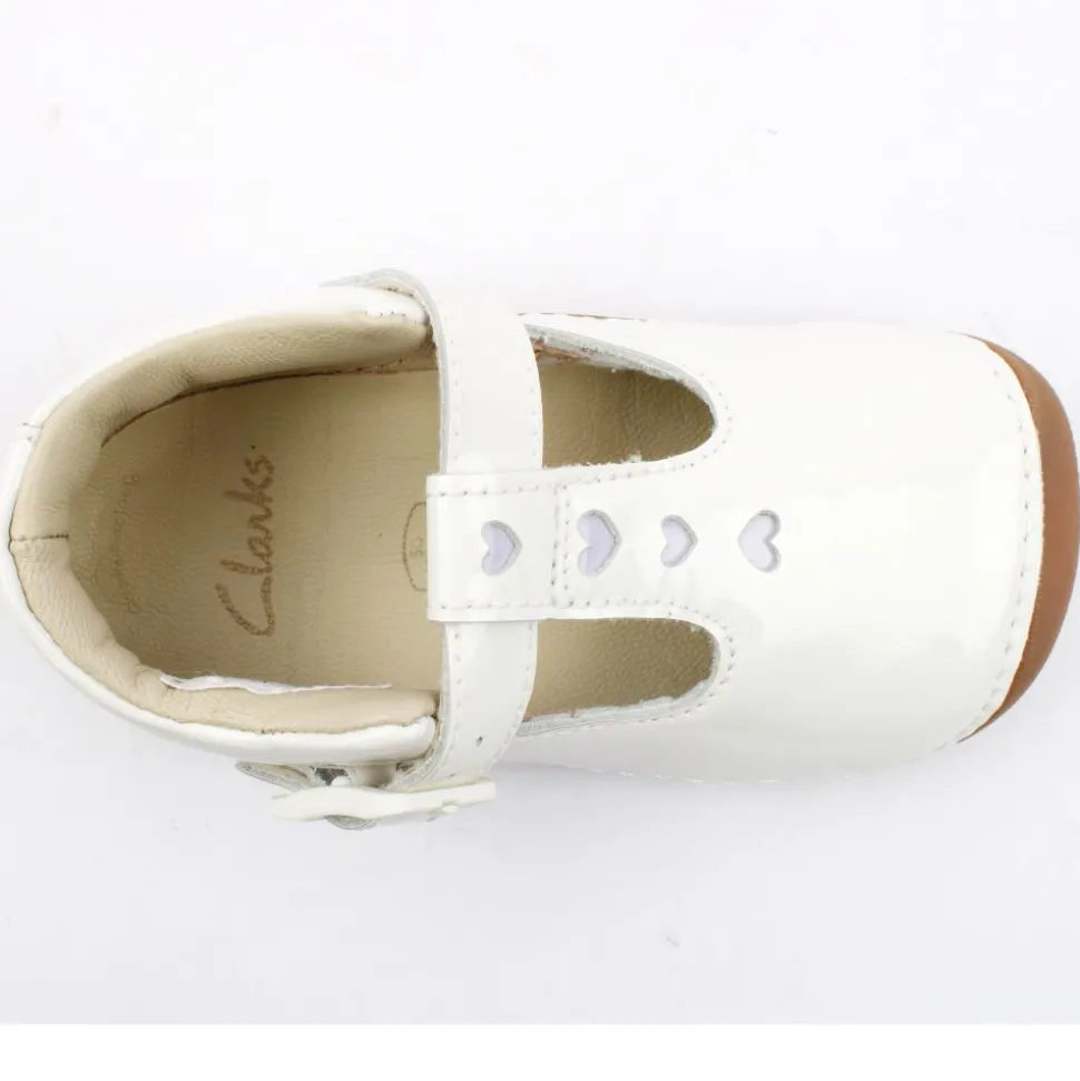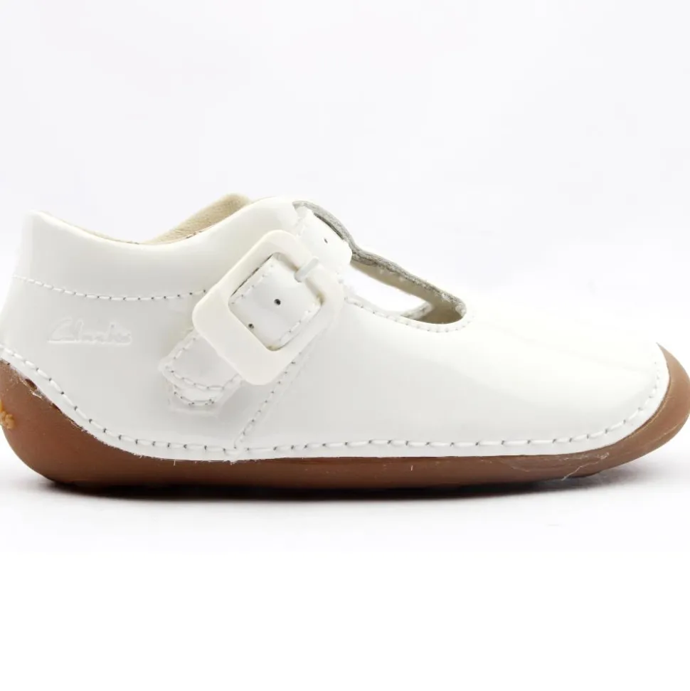 Tiny Beat T from Clarks was specially created for tiny toes.This pre-walker shoes are made from a premium soft white patent leather. The t-bar velcro offers a secure fit while the rubber sole is lightweight & flexible whilst offering grip.
