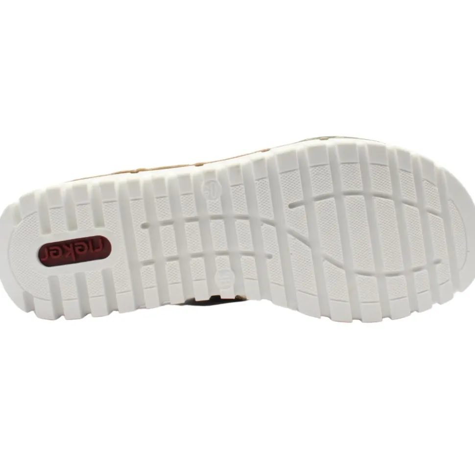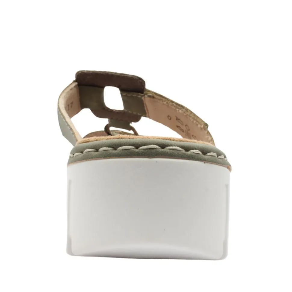 Step into effortless summer style with the Rieker ladies sandals style V1396. Designed in a khaki green, this chic and comfortable mule features a white low-profile wedge outsole for a subtle lift and a lightweight feel. The two adjustable straps ensure a secure and customizable fit, while the signature Rieker Antistress insole provides superior cushioning and support for all-day wear. Perfect for warm-weather outings, these versatile mules combine fashion and function, making them a must-have addition to your summer wardrobe.