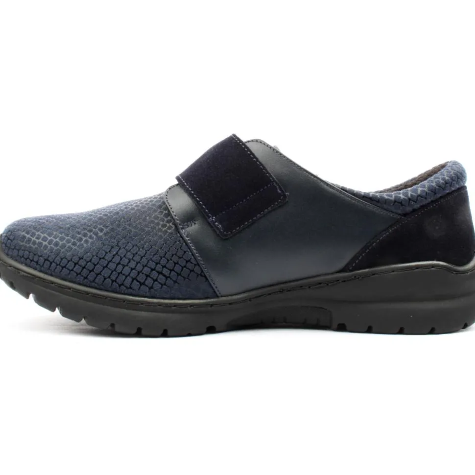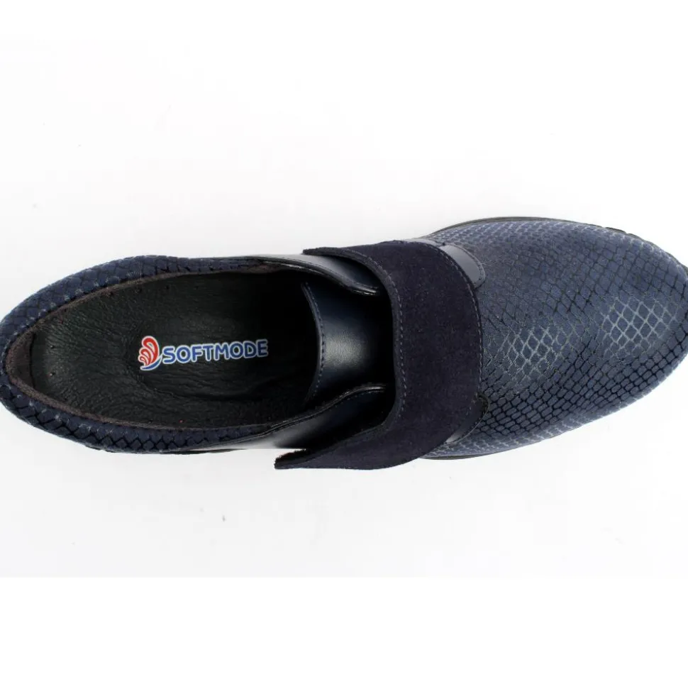 Extra wide fitting ladies shoes from Softmode. The upper is a combination of stretchy fabric and leather. The velcro strap allows these shoes to open up quite wide to allow for easy on/off. This shoe is an 3E extra wide fit. This style has a soft-tex membrane making it water repellent.This shoe has a removable insole.