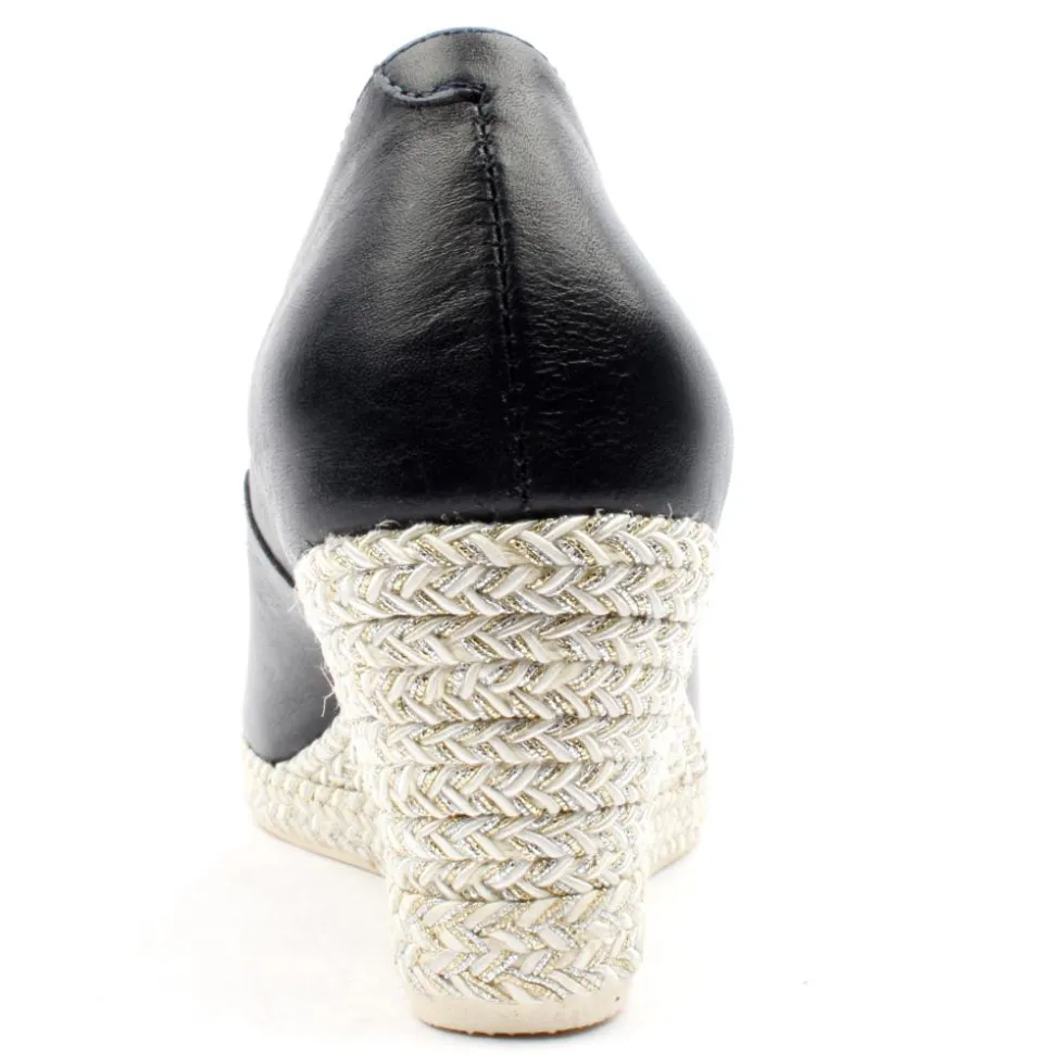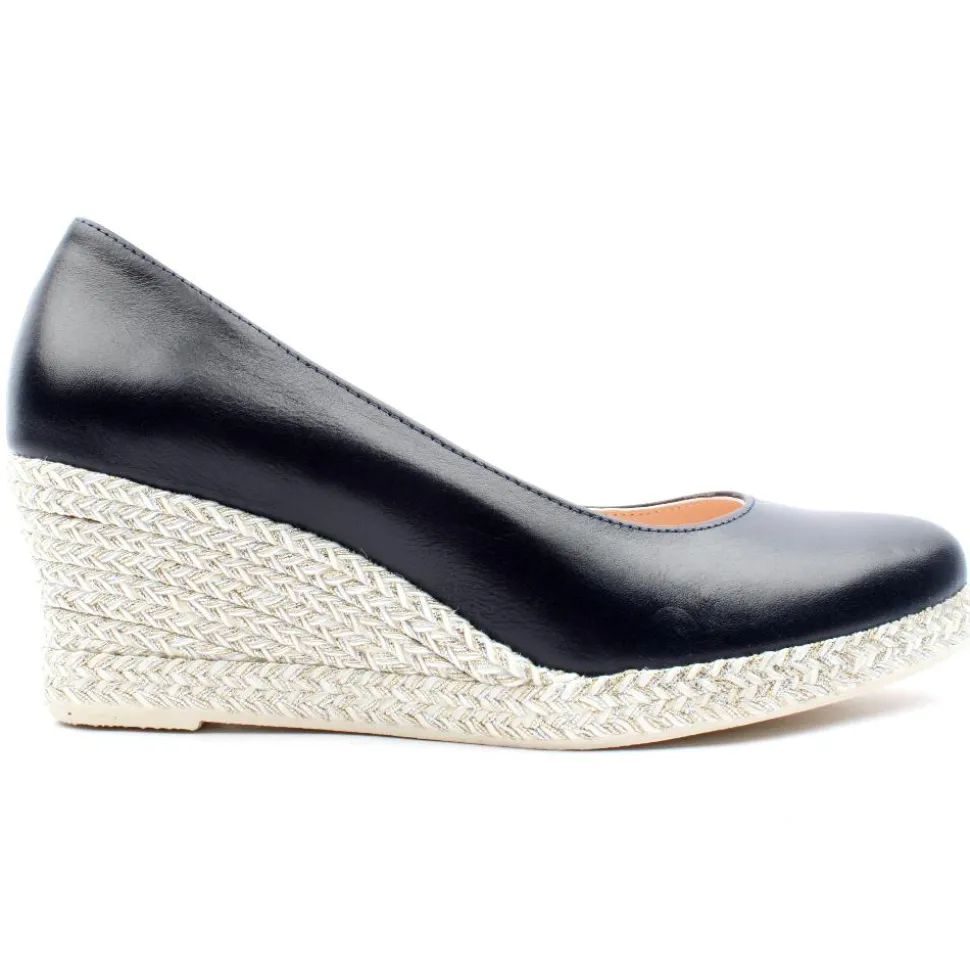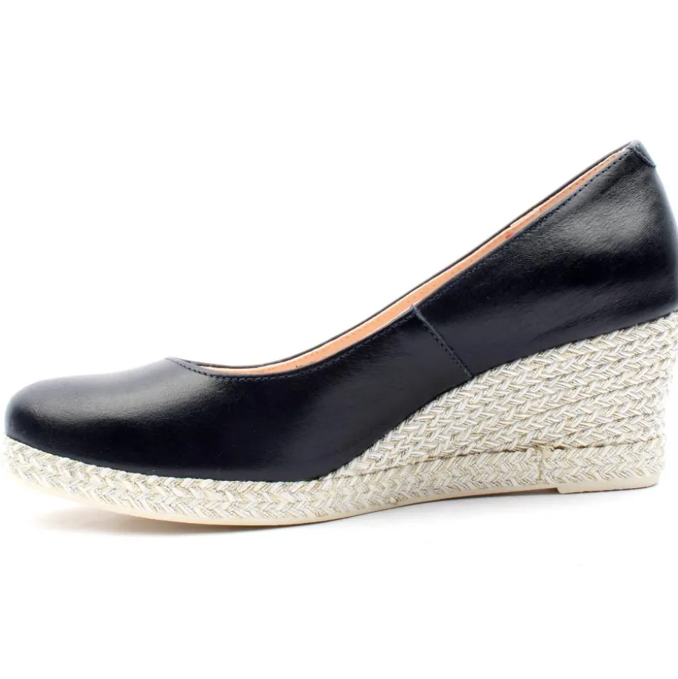 Stunning ladies wedge shoes from the Jose Saenz shoes range,Style 6019. This espadrille-style wedge features a navy leather upper. The rope-effect wedge sole adds a touch of rustic charm, while the approximately 6cm heel height offers a comfortable lift. Crafted in Spain, these shoes are designed with a textile lining and a cushioned insole to ensure all-day comfort. Ideal for both casual and formal occasions, the Jose Saenz 6019 wedge shoes seamlessly combines style and functionality.
