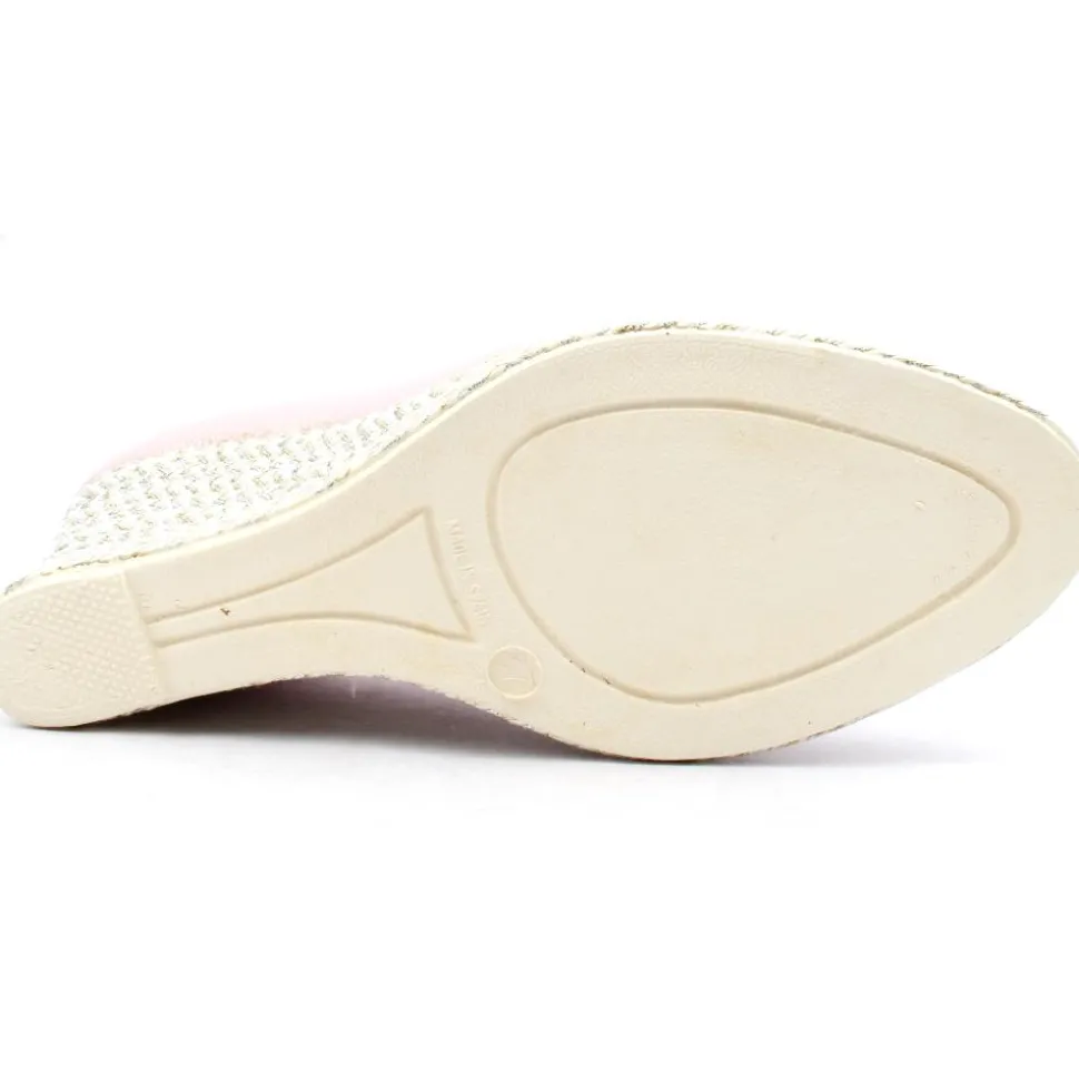Presenting an elegant wedge shoe from the Jose Saenz collection. Crafted with a delightful soft pink iridescent leather upper, it gracefully rests on an espadrille wedge sole. This shoe is lined with leather and features a padded insole, ensuring an extra layer of comfort for every step.