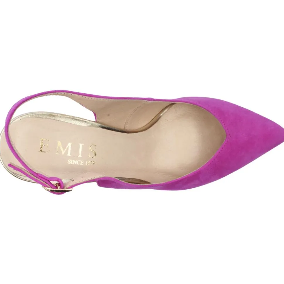 Stunning pink sling back court shoes from Emis shoes. Crafted with a pink suede upper and a pointed toe, this shoe exudes elegance.One notable aspect of this design is its two-toned block heel in pink and orange, adding a unique flair.The combination of the block heel and leather insole enhances the overall comfort of the shoe.